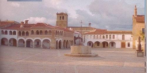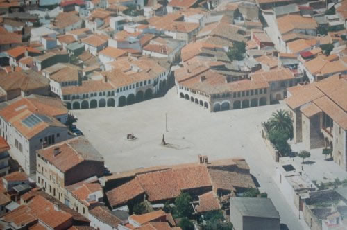 Considerada como una de las 12 plazas mayores de España. Este increíble conjunto arquitectónico se compone de casas flanqueadas de dos plantas, con soporte en columnas de granito y arquerías de ladrillo. Las casas mas antiguas fueron construidas en el siglo XV, de trazado gótico, aunque con muy clara influencia mudéjar. La plaza completa consta de 65 arcos y unos 103 ventanales. Tiene una dimensiones de más de 4000 m2, de trazado rectangular, con cinco accesos de entrada. La plaza esta considerada Monumento Histórico- Artístico de Interés Nacional. En las fiestas de San Roque es utilizada como coso taurino.
